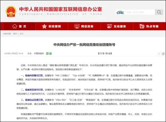不久前,中央网信办发布了名为《中央网信办严惩一批网络直播低俗团播账号》的公告。
