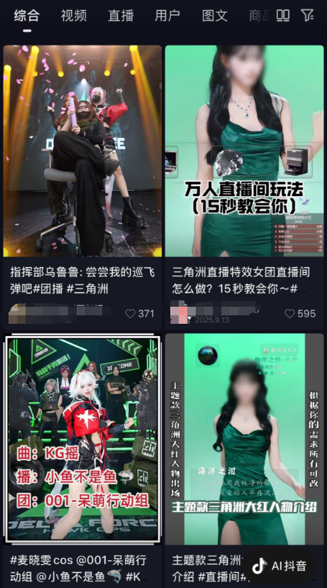 比如,如今团播赛道除了男团、女团、古风舞蹈等内容形式之外,开始出现“惊鸿客栈”、“寒光·摇水阁”等融入剧情演绎、充满故事性的团播;还可以看到,不少团播直播间开始探索与热门游戏IP的结合,如《三角洲行动》、《王者荣耀》等游戏角色cos团。