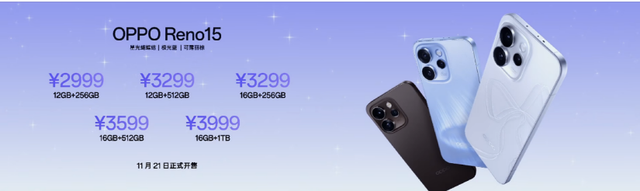 Reno15 提供星光蝴蝶结、极光蓝、可露丽棕三种配色,12GB+256GB 版本定价 2999 元;12GB+512GB 版本定价 3299 元;16GB+256GB 版本定价 3299元;16GB+512GB 版本定价 3599 元;16GB+1TB版本定价 3999元。