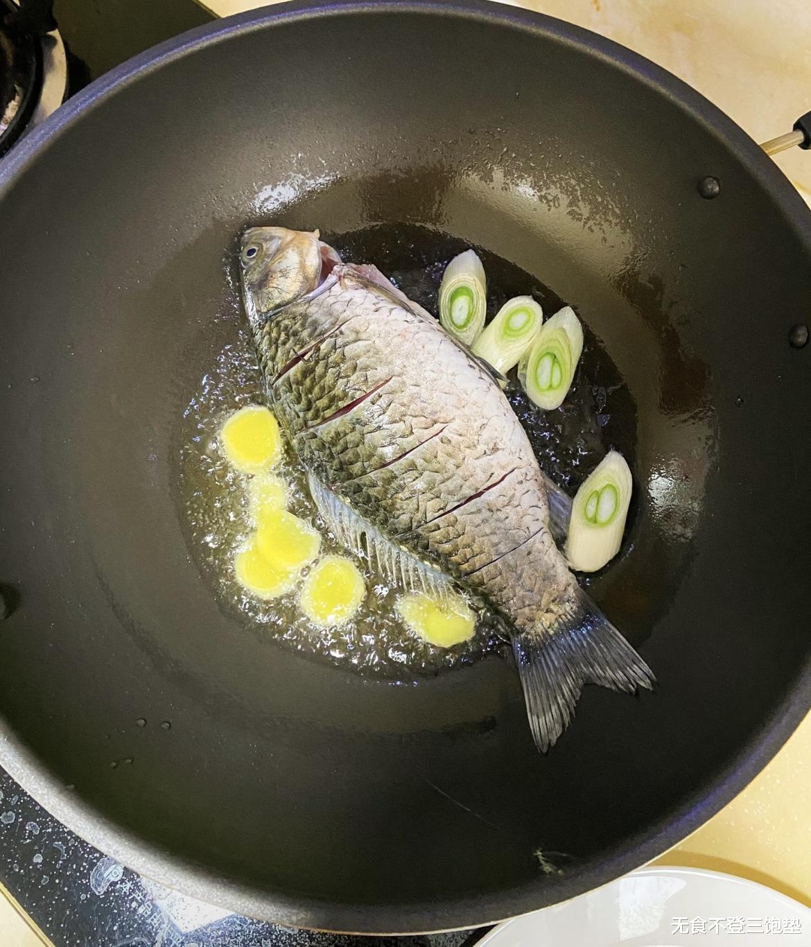 烹饪的重头戏来了!热锅凉油,油热后用姜片擦拭锅底,这样可以有效防止鱼皮粘锅。把擦干水分的鲫鱼轻轻放入锅中,保持小火慢煎。千万别急着翻动,等一面煎至金黄、定型后,再用铲子小心地翻面,把另一面也煎黄。这时,沿锅边淋入一勺料酒,高温会瞬间激发酒香,带走腥味。紧接着,最关键的一步来了——倒入足量的开水!水量要一次性加够,最好能没过鱼身。你会发现,滚烫的开水遇上煎得金黄的鲫鱼,汤汁会立刻开始发生变化。