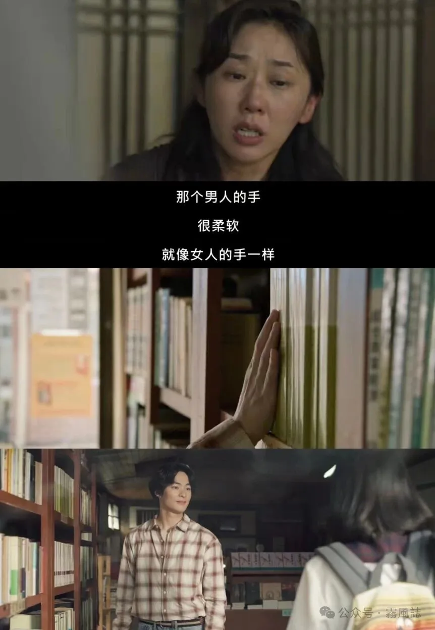 还有一处,警方找到一名死里逃生的幸存者,从那里得重要线索——犯人的手很柔软,下一个镜头就切到起范的手,这也是悬疑剧定律之“转场即答案”~镜头暗示幸存者所说柔软的手就是起范的。