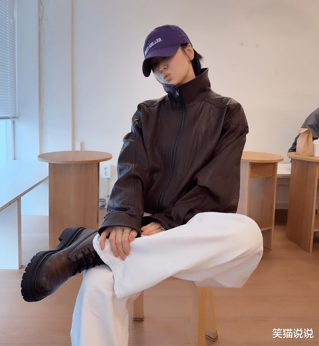 宋慧乔还晒出了其他造型的照片,照片中的她穿着棕色皮夹克外套搭配白色宽松的长裤与棕色皮鞋,她戴着紫色的棒球帽,看起来十分休闲舒适,又略带几分中性风格。宋慧乔坐在椅子上翘着腿,她侧着脸嘟嘴拍照,样子看起来有几分俏皮感。