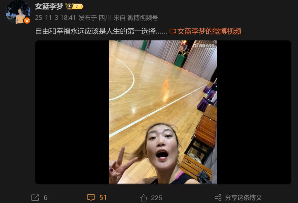 不过在国家队大门暂时关闭的同时,李梦的个人生活似乎并未因此停滞。在距离四川全运会女篮开赛仅剩4天之际,她选择在社交媒体上分享了自己的生活碎片。11月7日,四川队将迎来首场对阵山西的比赛,而在此刻,李梦的发文显得意味深长。她直言:自由和幸福永远应该是人生的第一选择。这短短一句话,在当前的背景下显得尤为刺眼,似乎在某种程度上回应了外界的纷扰。她同时分享的多张照片中,含有数字3的气球摆设得十分浪漫,外界普遍认为这是其男友张隆所准备。两人的感情公开已经过了几年,但两人在风波之中依旧稳固。退出国家队之后,李梦将全部精力专注于四川女篮,她的目标非常明确,那就是带领球队在全运会上争夺冠军。