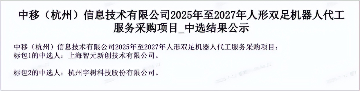 根据中国移动采购与招标网信息,智元机器以7800万元(含税)中标中国移动子公司人形机器人采购项目。