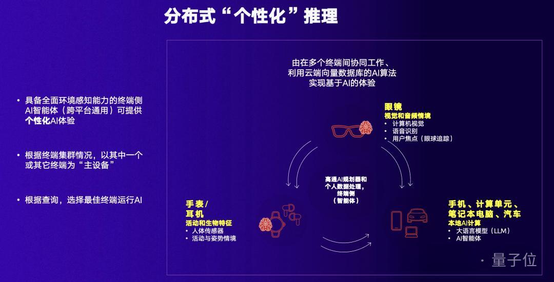 最后,对于未来的终端体验,他描绘了一个混合AI与分布式协同的图景——智能眼镜、手机、汽车将实现跨端的AI推理。