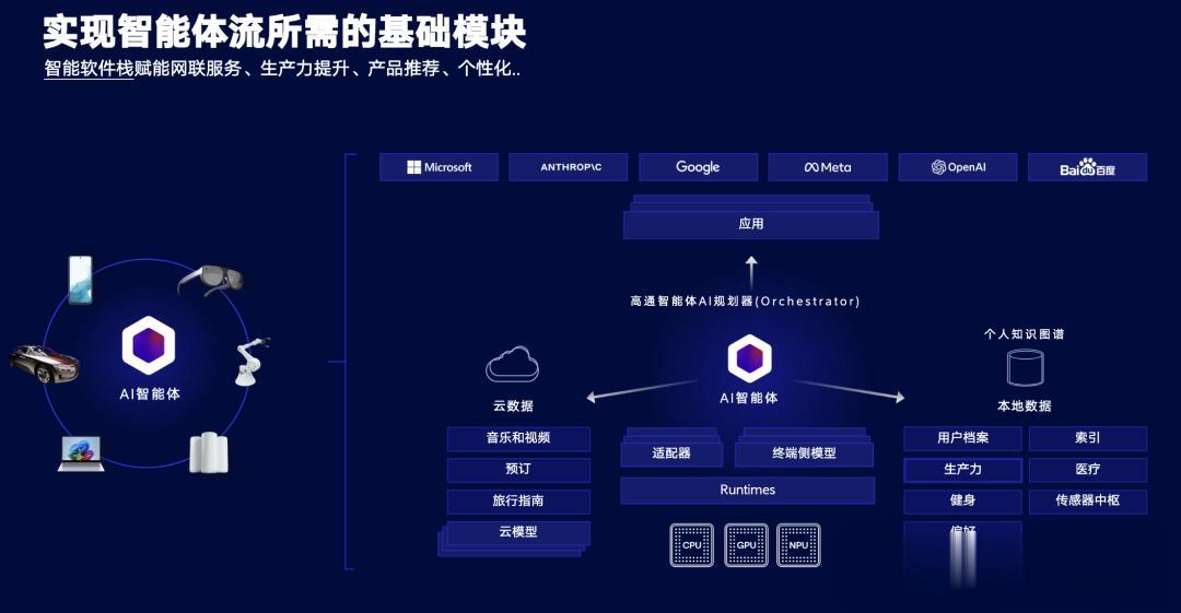 实现智能体AI需要许多基础模块,首先需要一个具有推理能力的大模型,它可以在端侧或者云上运行以理解用户意图;
