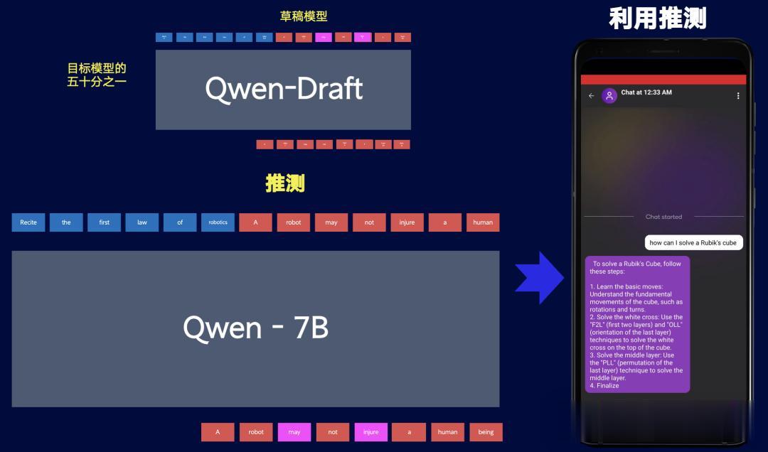 高通通过并行解码技术,先在端侧运行一个较小的草稿模型,一次性推理出多个token,然后将这些token交予原始的、较大的模型进行校验。