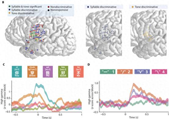 图说:通过颅内脑电记录大脑对语言(音节+声调)和非语言符号的神经活动,解析大脑不同脑区在“音节识别”“声调识别”等功能上的分工。