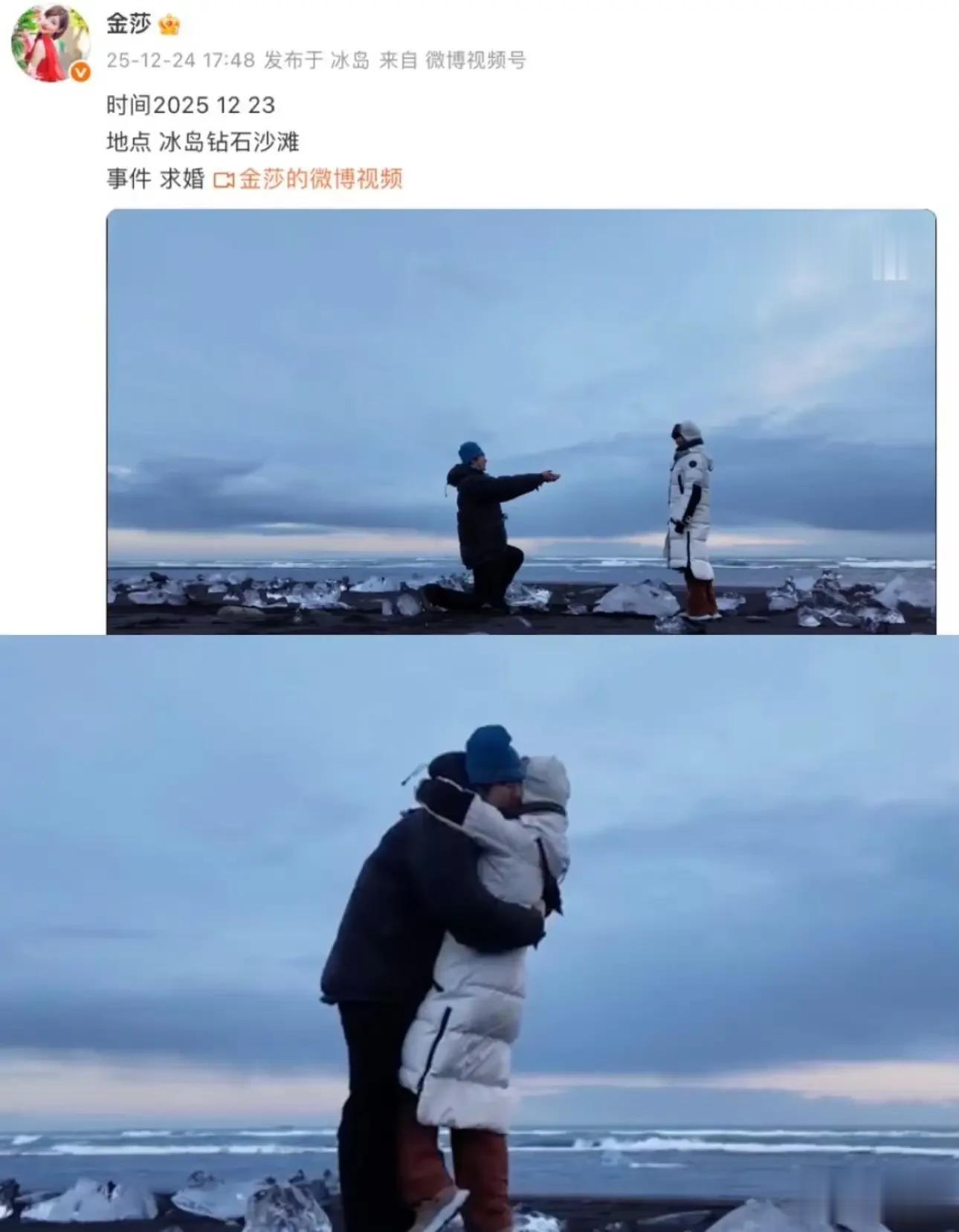 2025年12月23日,孙丞潇在冰岛钻石沙滩,对着漫天极光向金莎单膝求婚。