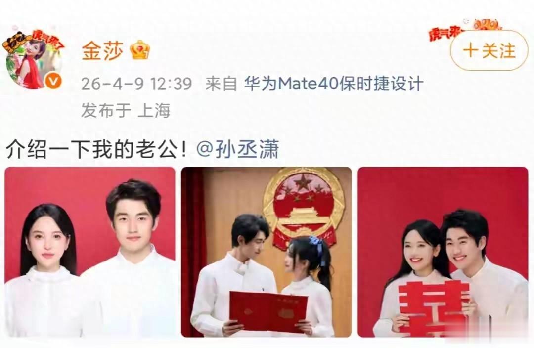 4月9日中午,43岁的金莎与26岁的孙丞潇同步在微博晒出红底结婚登记照,官宣领证结婚。