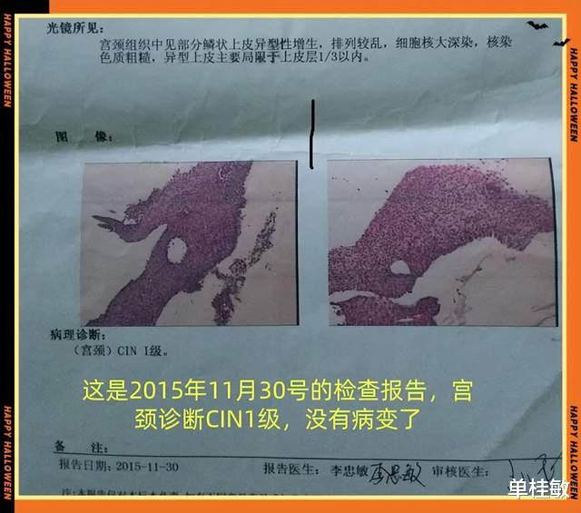 这个是2015年11月30好的检查报告,宫颈诊断CIN 1级,没有病变了,每一次的复查都是对我治疗的考验。