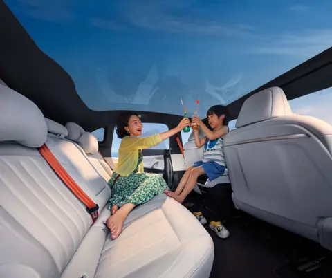 后备箱装东西的本事更让人惊喜。平时495升的容量就够用了,后排座椅放倒后直接扩大到1505升,再加上240升的前备箱,轻松实现"五人五箱"的装载需求。我试过同时塞进两个28寸托运箱和三个24寸登机箱,居然还有空余放杂物。贴心的是下沉式设计,连家用大冰柜都能轻松装下。现在全家去露营,帐篷、烧烤架、折叠桌椅统统都能带上,再也不用纠结哪些东西必须留下了。我个人觉得,乐道L60用灵活多变的空间设计和实用的装载能力,真正解决了家庭出行的收纳难题,特别适合经常全家出游的用户。