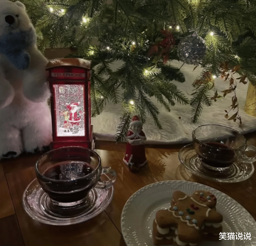 似乎是为了提前庆贺圣诞节的到来,李英爱在圣诞树前摆放着美食,旁边还放着一个可爱的北极熊玩偶。北极熊玩偶的旁边还放着一个圣诞老人的摆件,看起来很有圣诞节的氛围感。
