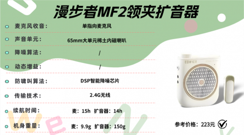 得胜E10W是一款面向教师、培训以及小型活动场景的无线领夹扩音器。它采用全指向麦克风设计,能够均衡收录演讲者的声音,并搭配76mm稀土强磁大喇叭,结合AI防啸叫技术,有效抑制环境噪声和啸叫,使声音清晰自然,适合教室、会议或户外使用。无线方面支持蓝牙5.3和2.4G双模传输,最远覆盖20米,信号稳定,低延迟保证声音与讲解同步。续航表现也很不错,麦克风可连续使用6-7小时,扩音器本体续航约23小时,配合Type-C接口充电方便,满足全天授课或活动需求。扩音器整体重量适中,麦克风30g,扩音器165g,佩戴携带轻松便捷。◎漫步者MF2无线领夹扩音器(223¥)