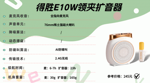 索爱S5是一款面向教学、培训及小型活动场景的无线领夹扩音器。它采用全指向麦克风设计,能够均衡捕捉演讲者的声音,扩音器配备78mm大喇叭,结合DSP防啸叫芯片,有效抑制环境噪声和啸叫,使声音清晰自然,即使在空调或风扇环境下也能保持良好的听感。无线方面支持蓝牙5.4和2.4G传输,最远覆盖30米,信号稳定,低延迟保证声音与讲解同步,适合教室和户外使用。续航表现出色,发射器可连续使用14小时,扩音器本体约20小时,Type-C接口充电方便。设备还支持3.5mm TRS接口,以及TF卡、U盘、AUX播放,兼容性较强。整机重量适中,麦克风20g,扩音器266g,佩戴携带都轻松。◎得胜E10W无线领夹扩音器(245¥)