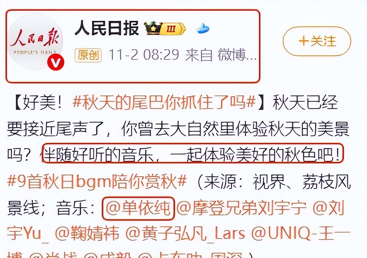 11 月 8 日上午 10 时,《人民日报》官方客户端发布文化评论《文艺作品如何讲好时代故事》,首次点名单依纯,文中提到她的单曲《时光里的答卷》以 “乡村振兴” 为背景,通过真实的乡村故事与传统民乐元素,展现当代青年的奋斗精神,上线一周播放量破亿,成为 “用音乐传递正能量” 的典型案例。