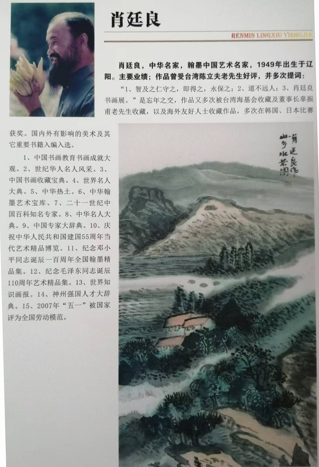 肖廷良中华名家,翰墨中国艺术名家,1949年出生于辽辽阳主要业绩:作品曾受台湾陈立夫老先生好评,并多次提词:“1、智及之仁守之,即得之,永保之;2、道不远人3、肖廷良书画展。”是忘年之交作品又多次被台湾海基会收藏及董事长辜振甫老先生收藏,以及海外友好人士收藏作品多次在韩国、日本比赛获奖,国内外有影响的美术及其它重要书籍入编入选。1、中国书画教育书画成就大观。2、世纪华人名人风采。3、中国书画收藏宝典。4、世界名人大典,5、中华热土。6、中华翰墨艺术宝库,7、二十一世纪中国百科知名专家,8、中华名人大典。9、中国专家大辞典。10、庆祝中华人民共和国建国55周年当代艺术精品博览。11、纪念邓小平同志诞辰一百周年全国翰墨精品集。12、纪念毛泽东同志诞辰110周年艺术精品集。15、世界知识画报。16、神州强国人才大辞典。17、2007年“五一”被国家评为全国劳动模范。