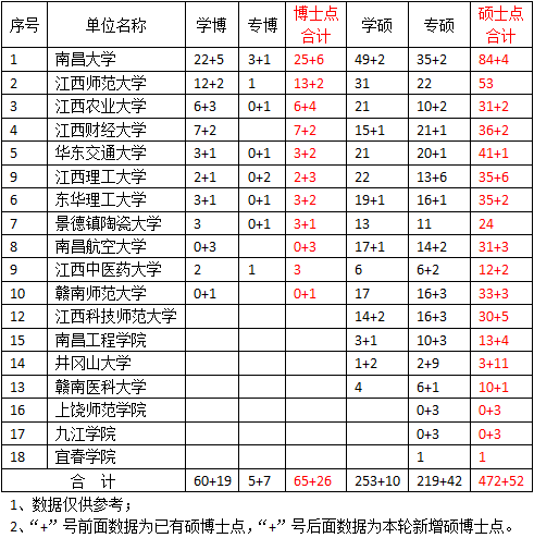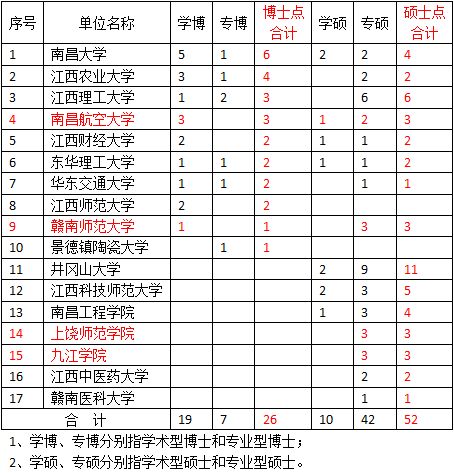 江西高校共新增26个博士学位授权点和52个硕士学位授权点。其中新增一级学科博士点19个,专业学位博士点7个,一级学科硕士点10个,专业学位硕士点42个。