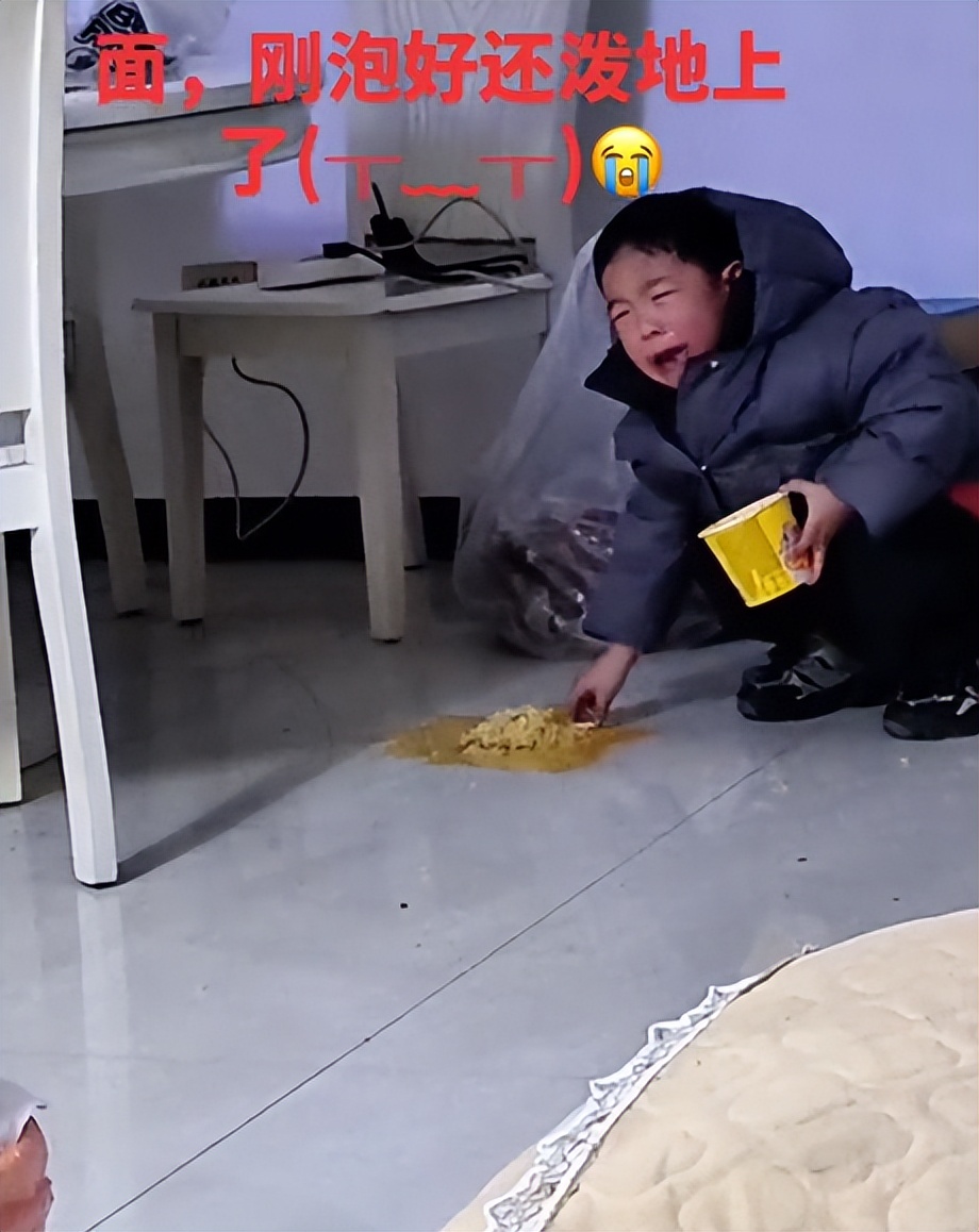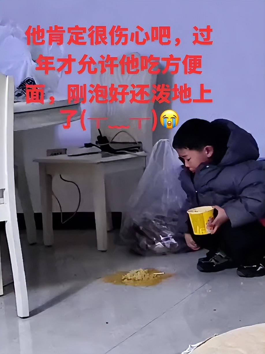 对着一碗打翻的泡面不停的大哭,家长也觉得他特别伤心,但是实在是难以给出解决方法,据说他们的家庭条件是只有在过年的时候才允许他吃方便面。
