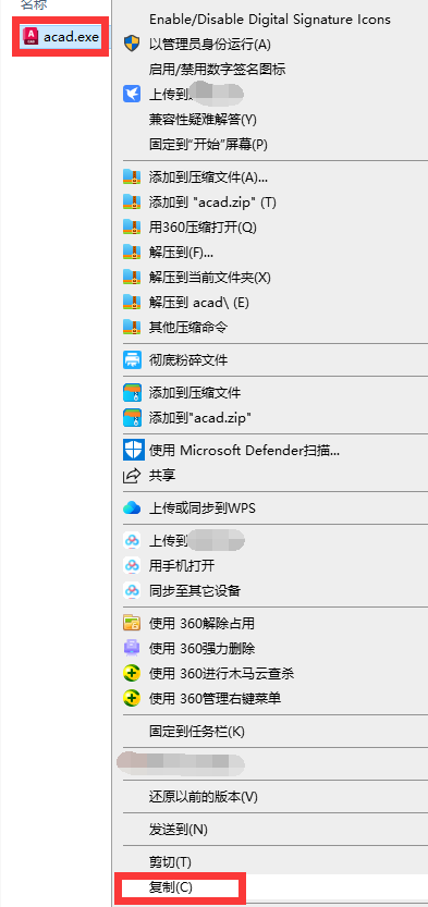 11、点击【acad】文件,鼠标右键,选择【复制】。