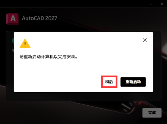 8、安装完成后会出现是否重启电脑的界面,点击【稍后】。