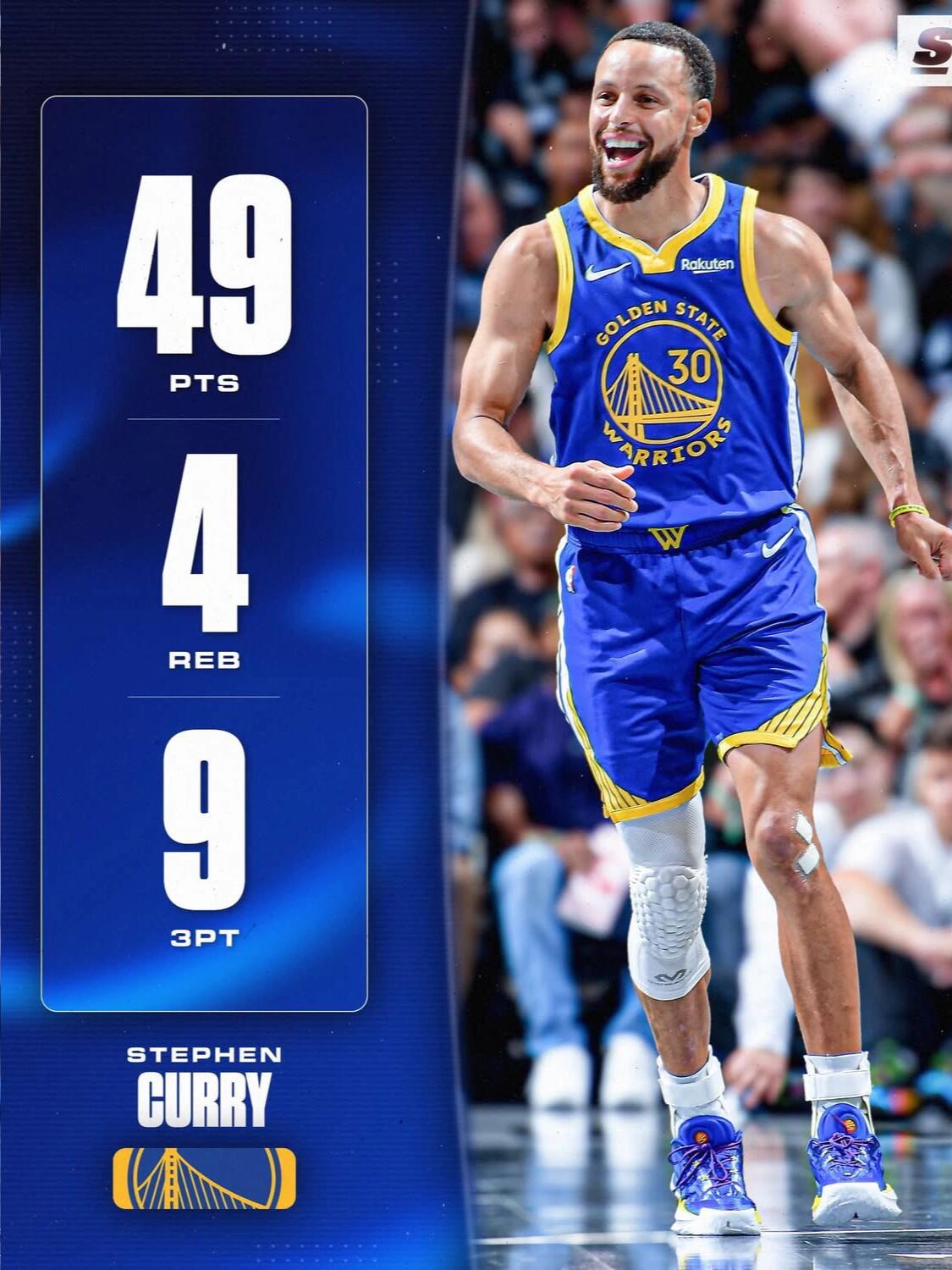 库里封神之夜,一战刷爆历史纪录库里本场比赛26投16中,三分球17中9,罚球8罚全中,以极高的效率砍下49分。