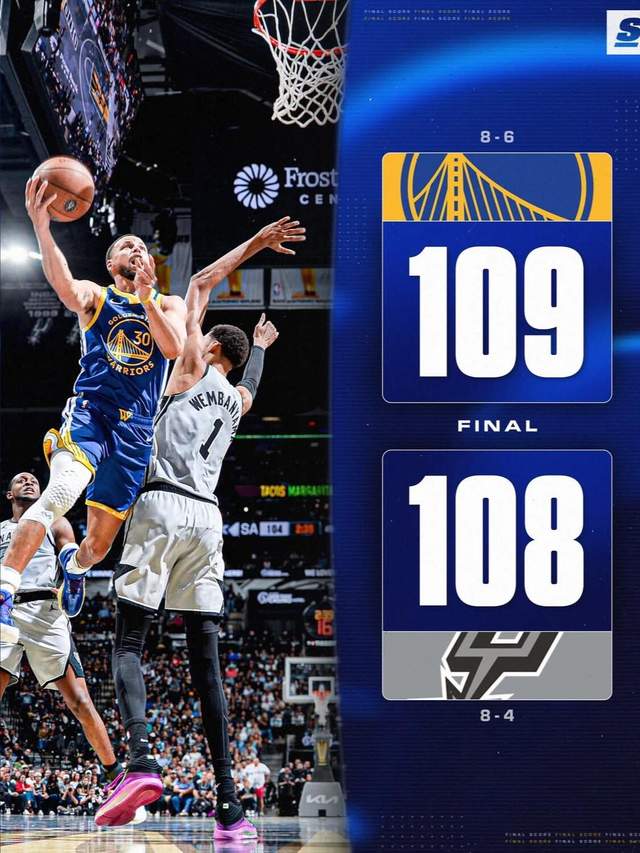 金州勇士客场以109-108险胜圣安东尼奥马刺,三天内双杀对手。37岁的斯蒂芬·库里再次成为比赛主宰,全场轰下49分,其中包括9记三分球,并在最后时刻用罚球完成准绝杀。