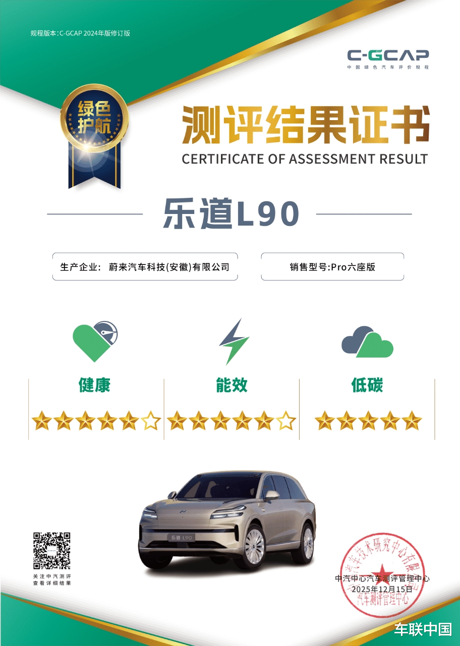 2025年12月15日,中汽中心最新一期安全与绿色评测结果正式发布,乐道L90以无可争议的"双五星"成绩,成为大三排SUV品类首个同时获得C-NCAP安全认证和C-GCAP绿色能效认证双五星评价的车型。这一里程碑式的成就,不仅彰显了蔚来旗下乐道品牌的技术实力,更为整个大三排SUV市场树立了新的品质标杆。