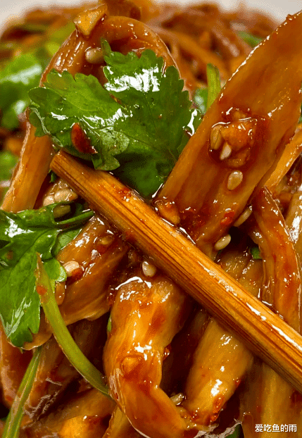 把撕好的杏鲍菇放进大碗,淋上调好的料汁,再撒一把香菜段或葱花,戴上手套快速抓拌均匀。动作要轻快,别把菇条搅碎;拌好后可以静置5分钟,让味道慢慢渗透。如果时间充裕,盖上保鲜膜冷藏10分钟再吃,冰凉脆嫩,夏天吃简直爽到飞起!