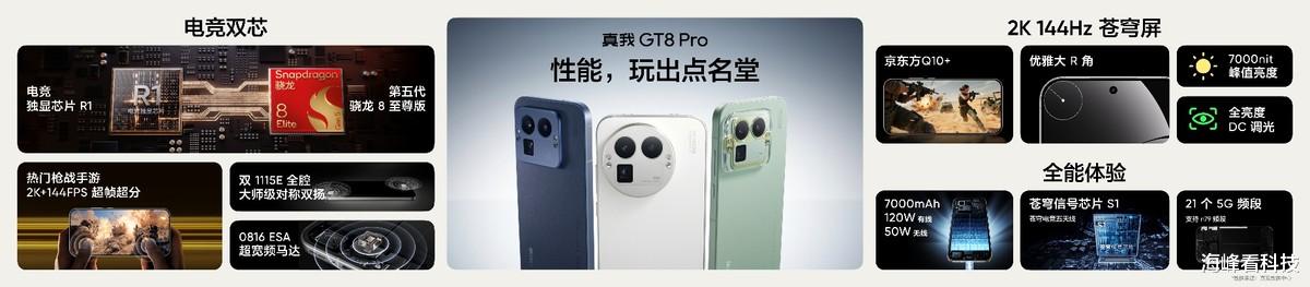 除真我GT8 Pro外,本次发布会还带来了“最强标准版”——真我GT8。它在极致性能与旗舰影像之间不做选择。真我GT8搭载“骁龙8至尊版+电竞独显芯片R1”旗舰双芯,以及Pro同款2K 144Hz苍穹屏,在性能与显示上,实现了对Pro级体验的完整继承,同样支持超百款游戏的超分超帧,畅享2K+144Hz的电竞生态。