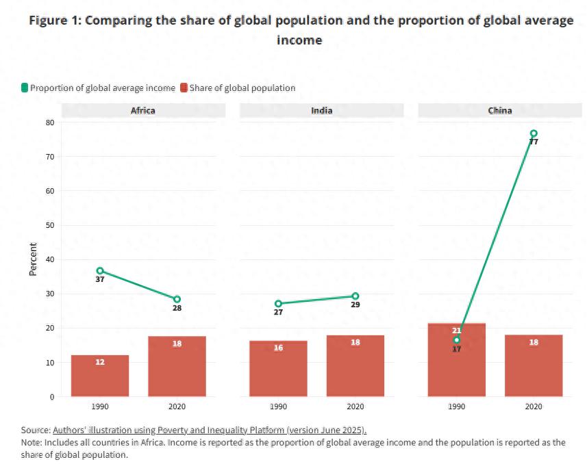 与其他类似的人口群体相比,这是一个显著的变化。以印度和非洲大陆为例。截至2020年,这两个国家在全球人口中的占比与中国相似——均为18%。此外,这两个人口群体在1990年也拥有较高的全球平均收入占比。与中国的收入增长相比,这些地区在全球平均收入中的占比要么下降(非洲),要么增长幅度不大(印度)。换句话说,1990年,非洲或印度的平均收入高于中国人的平均收入。这也意味着中国的增长速度明显快于世界平均水平,而非洲的增长速度较慢,印度的增长速度与世界平均水平大致持平。