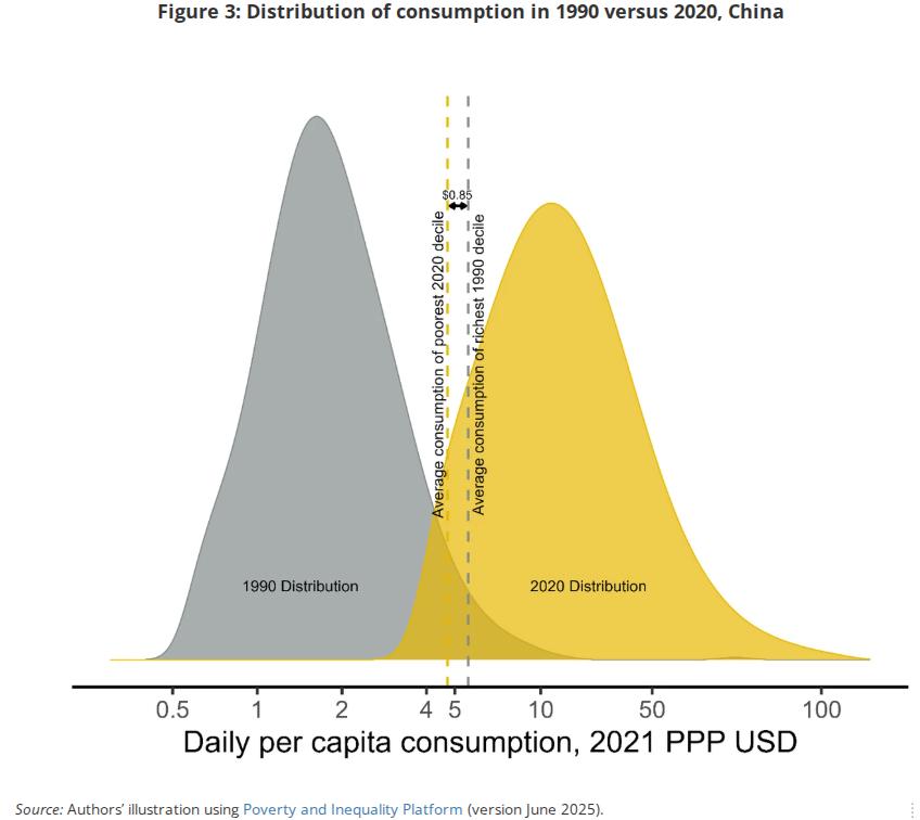 中国的收入增长如此显著,以至于平均而言,除了收入最低的十分之一人群外,2020年所有人群的收入都已超越了1990年收入最高的十分之一人群,如图3所示。1990年最富裕的十分之一人群与2020年最贫困的十分之一人群之间的日均收入差距不到一美元,而1990年最富裕的十分之一人群的收入则更高。