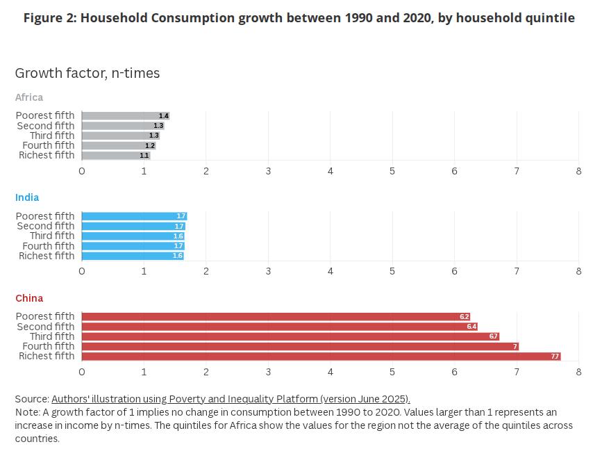 过去三十年,中国不仅平均水平,而且全民消费都经历了非凡的增长。图2显示了1990年至2020年中国、非洲和印度按消费五分位(即人口的五分之一)细分的消费增长情况。中国最富裕的五分之一人口的消费增长了近八倍,而最底层的五分之一人口的消费增长仅略高于六倍。
