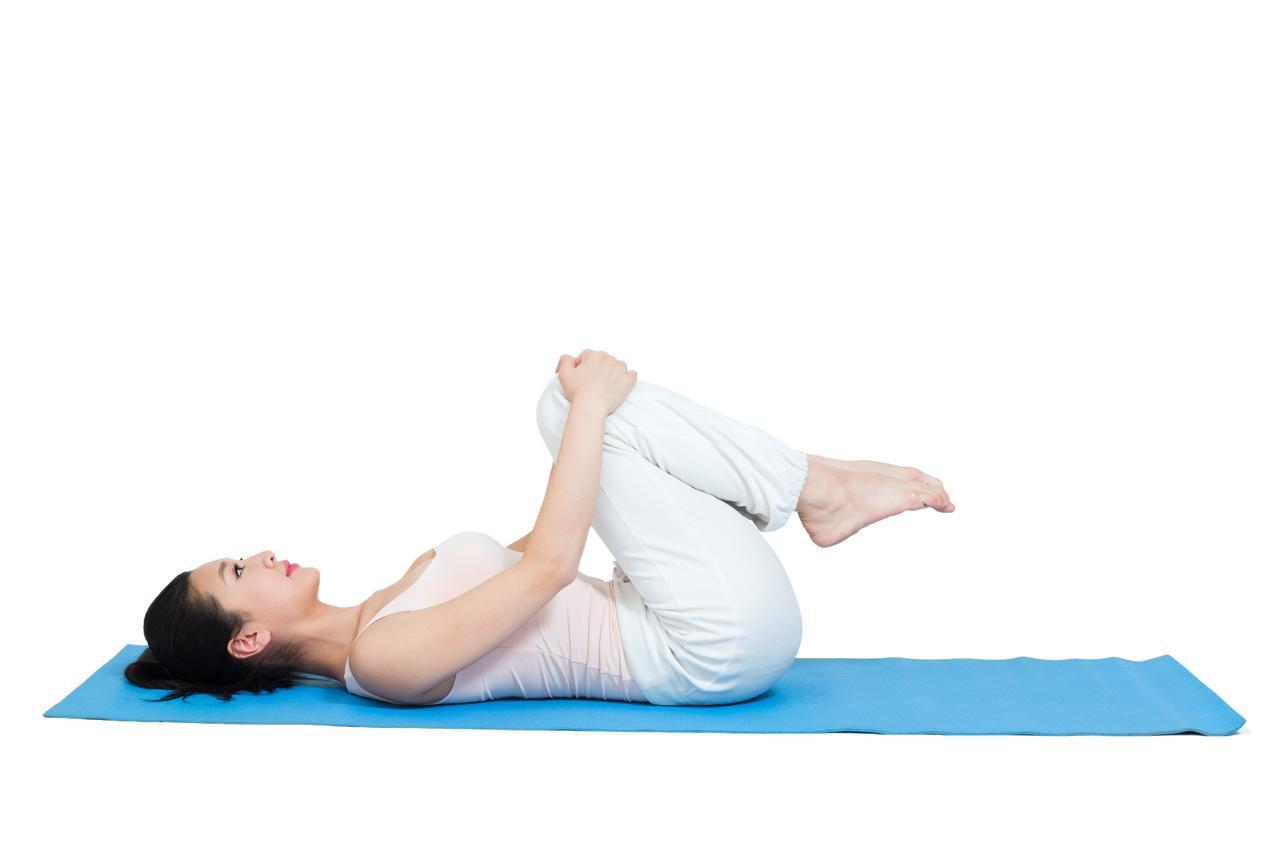 仰卧屈膝摇摆,松开腰腹的紧绷靠墙站立改善了盆腔的血流状态,下一步需要处理的是腰腹部已经紧绷起来的肌肉群,这时候仰卧屈膝摇摆是特别合适的动作。