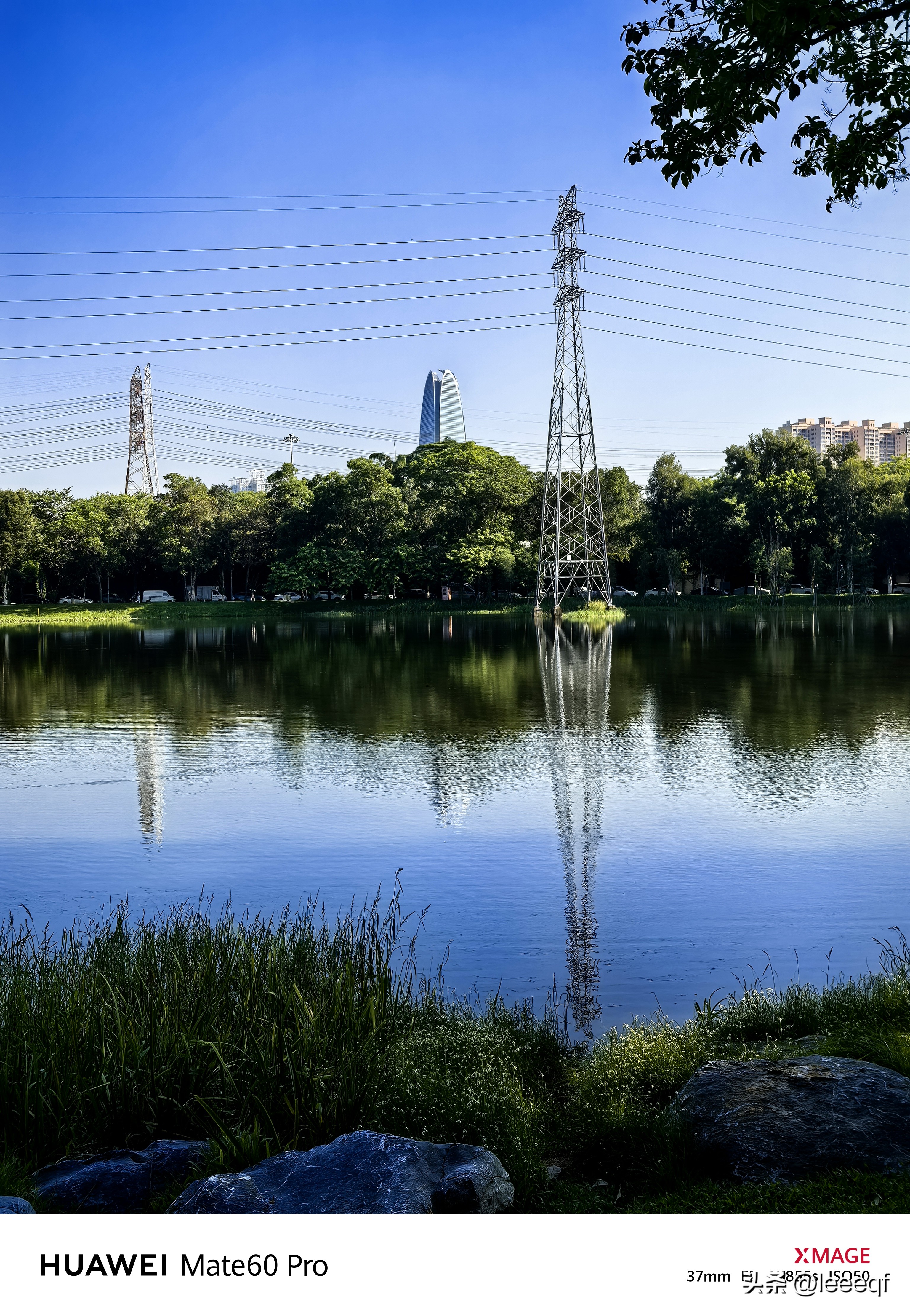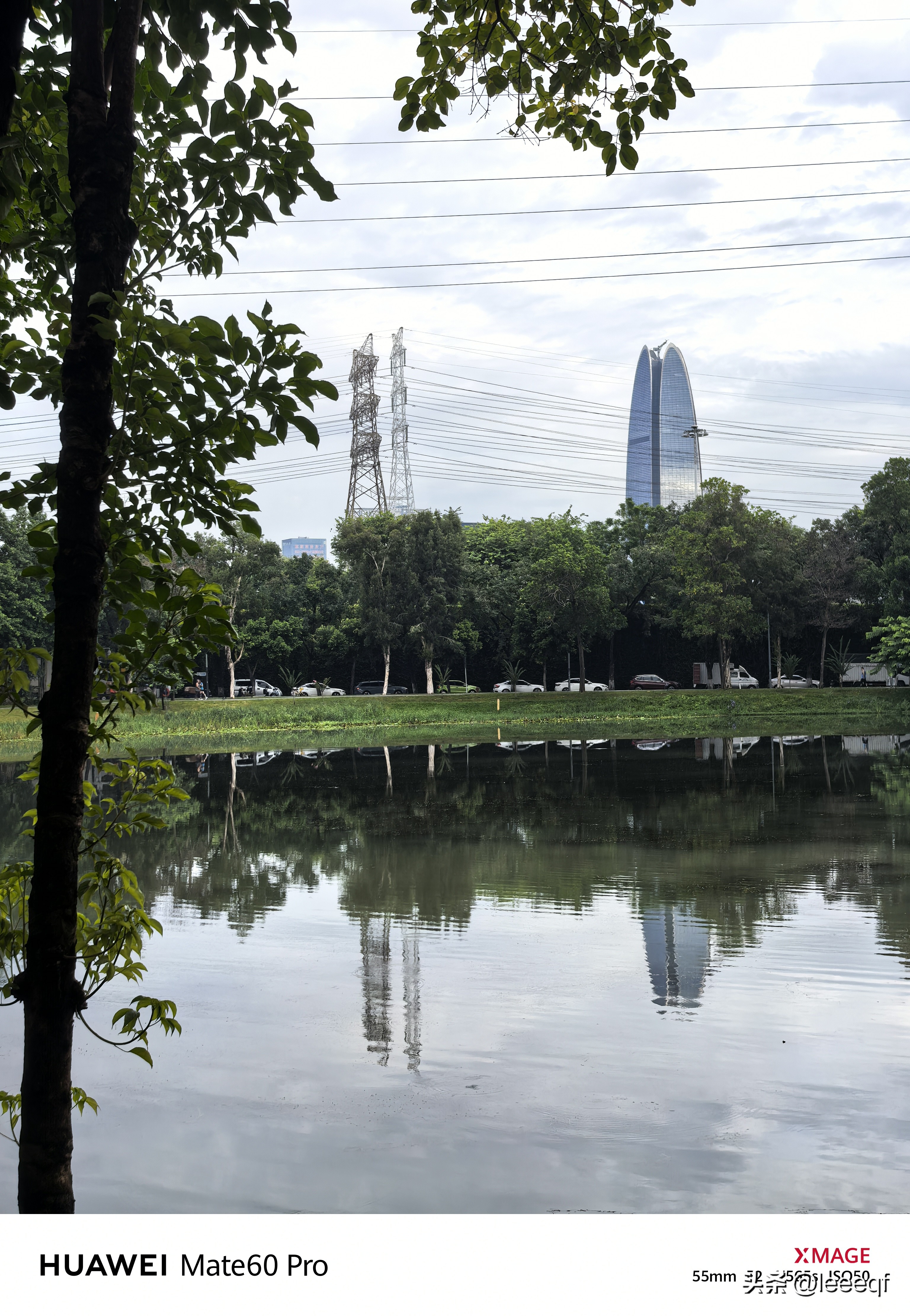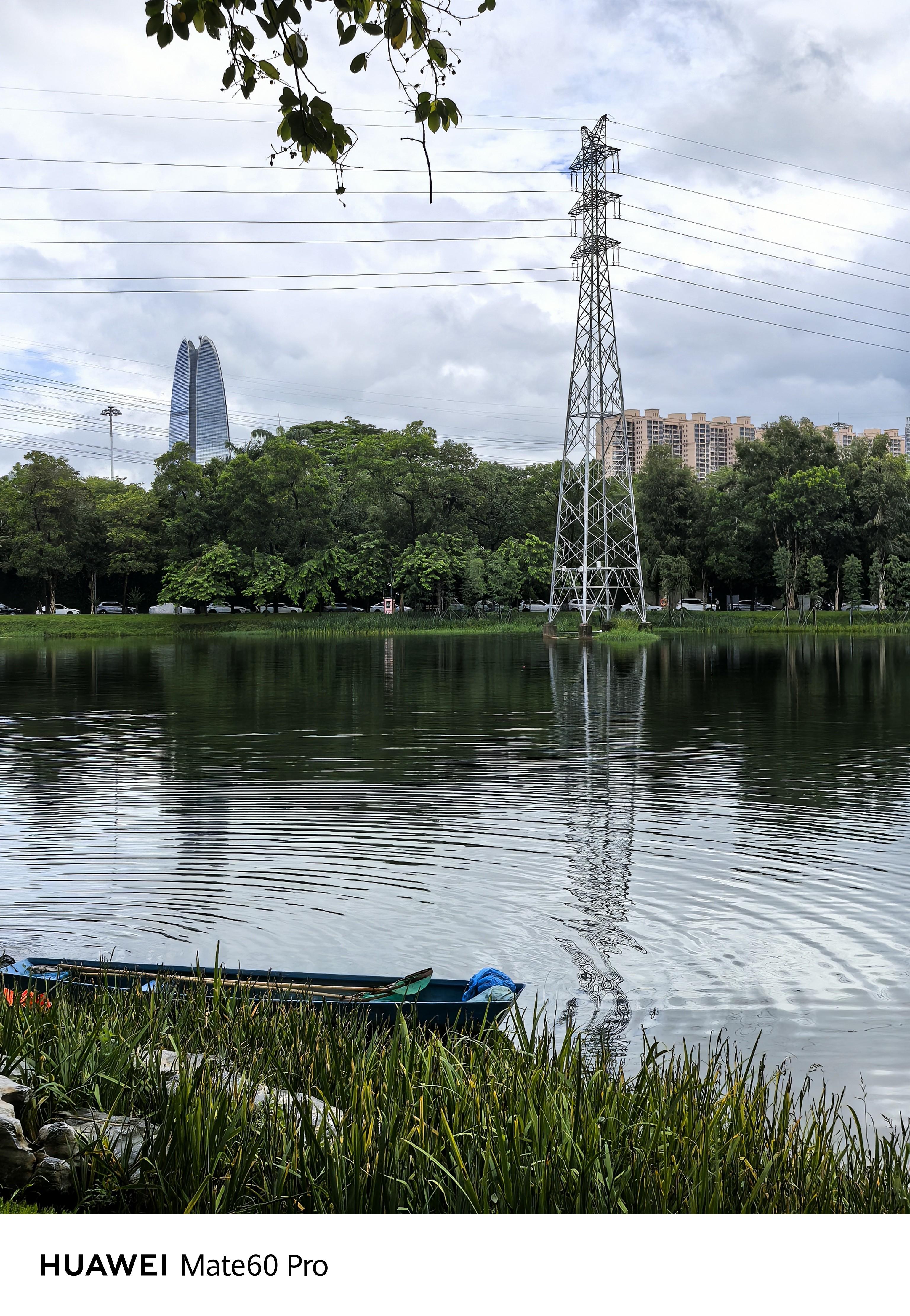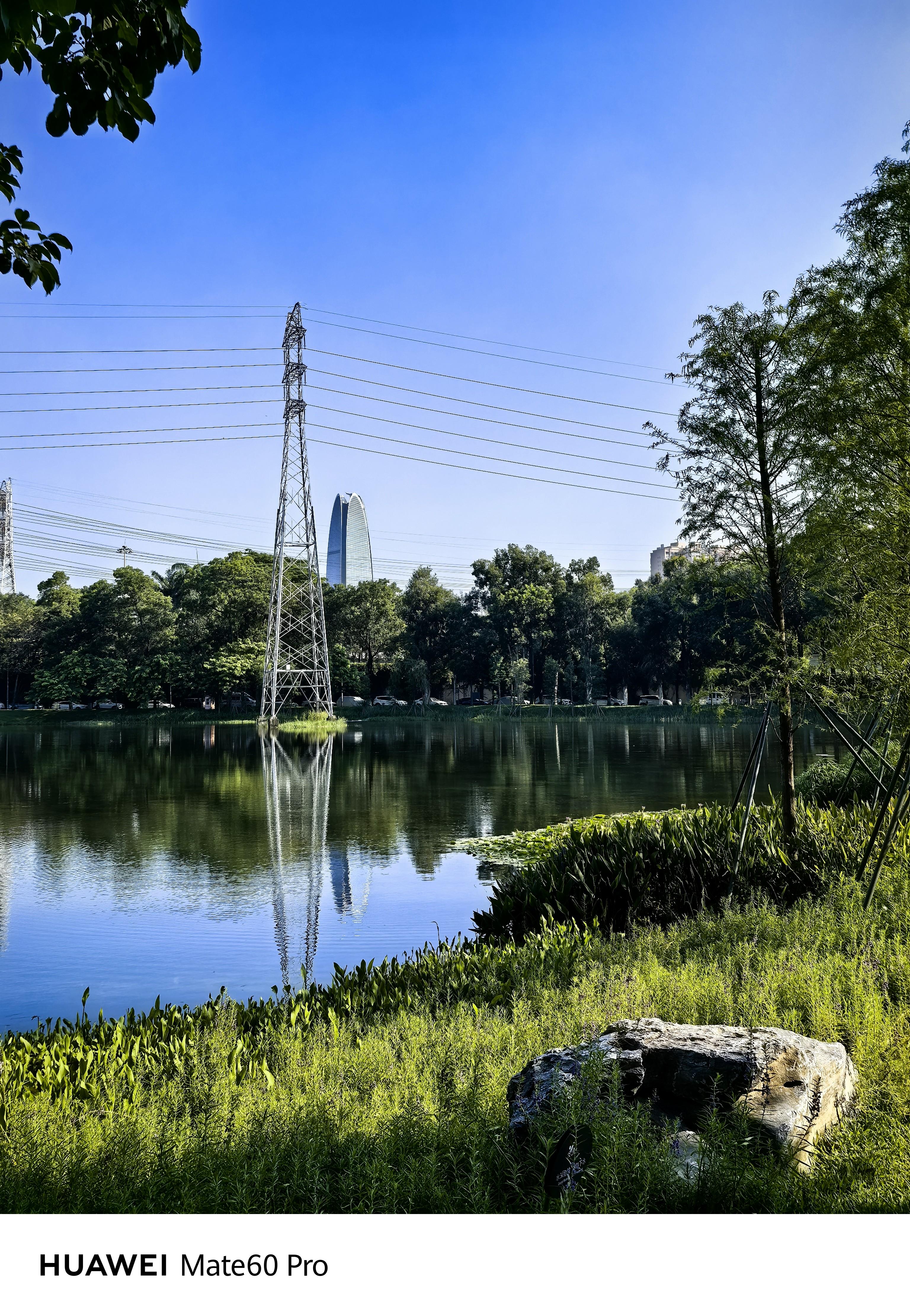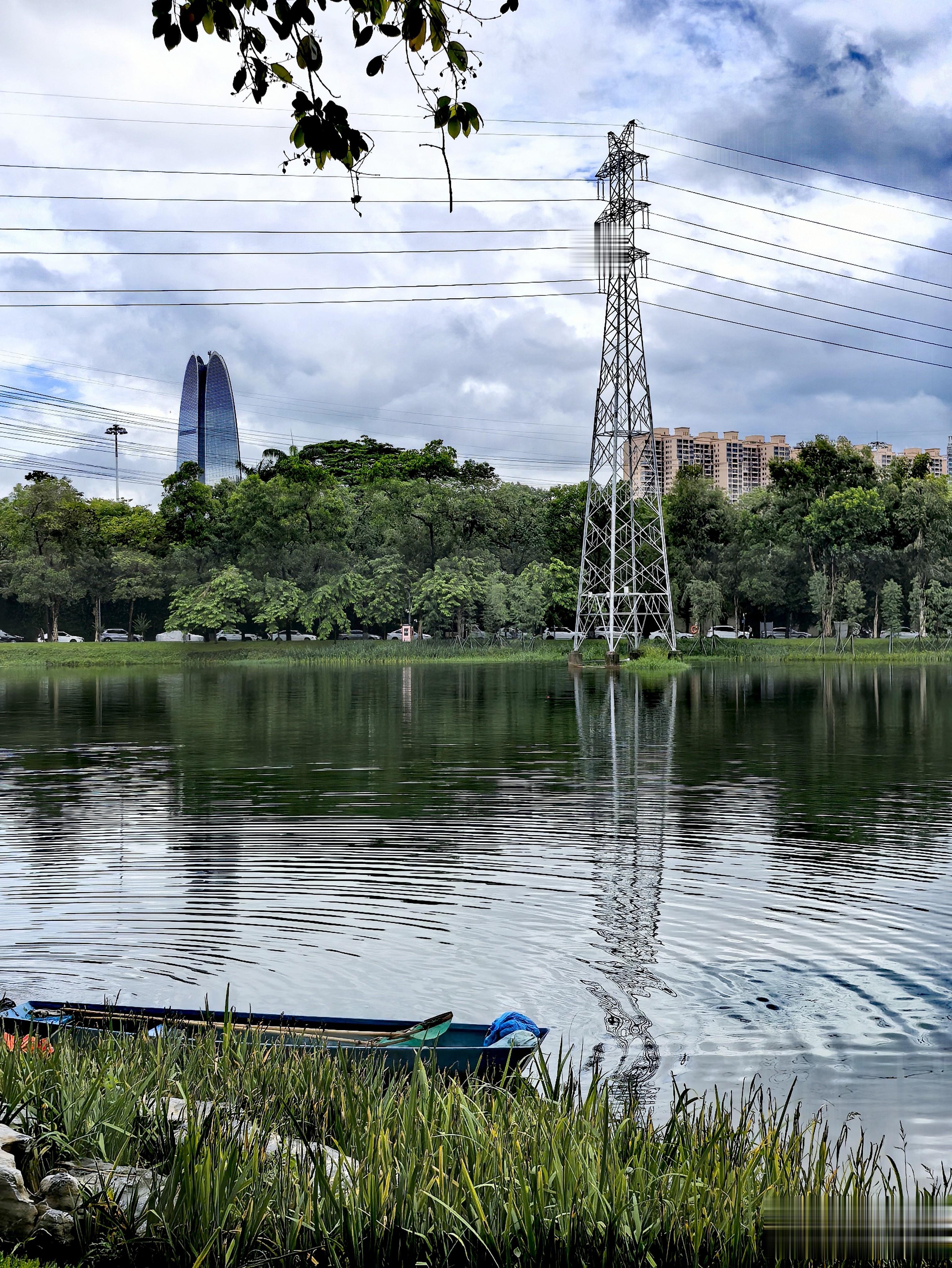 湖水静静的,如一面镜子,将蓝天、绿树、高压电线塔与远处的楼宇一一纳入,倒映水中,浑然一幅茶峒白河的模样。