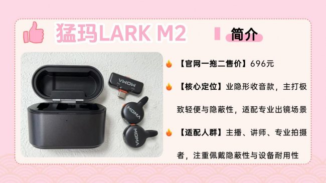 猛玛LARK M2售价629元,主打极致轻便与隐蔽佩戴,基础性能够用,适合预算充足、追求低调出镜的主播、讲师等人群。
