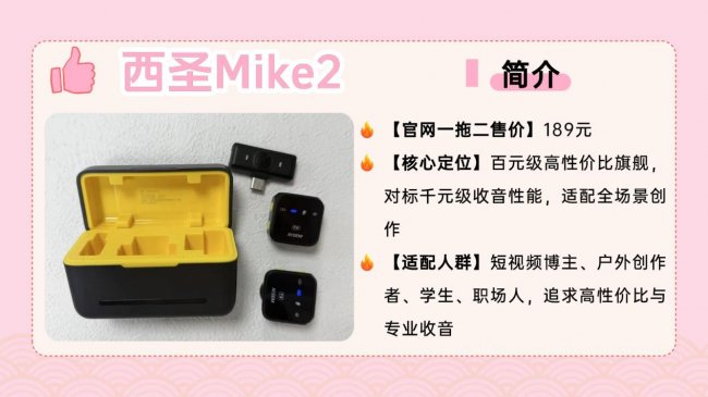 产品定位:西圣Mike2作为品牌旗舰领夹麦,主打百元价位千元音质,售价仅189元,凭借硬核配置被称作百元档性能标杆。