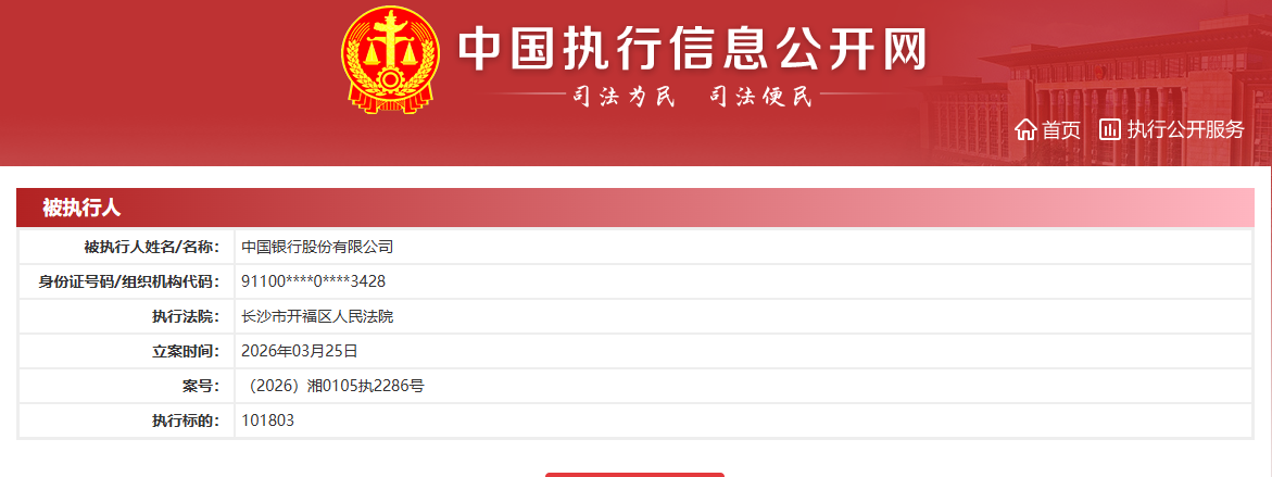 城市头条消息 据中国执行信息公开网铁证显示:3 月 25 日,中国银行股份有限公司(组织机构代码:10000134-2)被长沙市开福区人民法院立案执行,案号(2026)湘 0105 执 2286 号,执行标的101803 元。