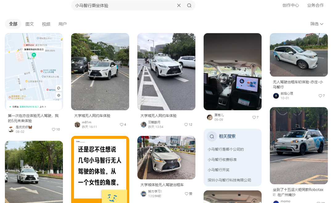 用户在小马智行(PonyPilot)app上进行预约,就可以乘坐由“虚拟司机”驱动的无人车。在社交平台中,有不少网友分享了乘坐体验反馈,“女性友好”“舒适独处的无人胶囊”“起步贼猛”“车费略贵”等等。