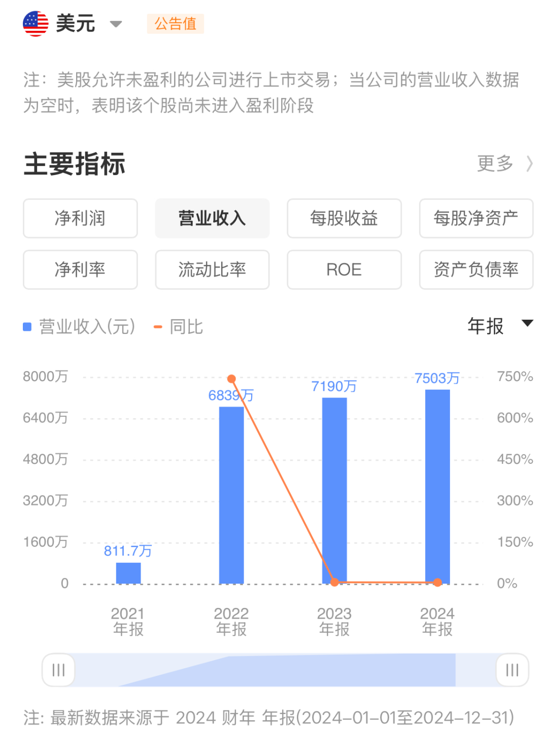 2024年,公司总营收0.75亿美元,比2023年增长了约312.6万美元,增速4.35%。相较之下,公司的经营开支总额从2023年的1.6亿美元涨到了2024年的2.97亿美元,增速85.6%。