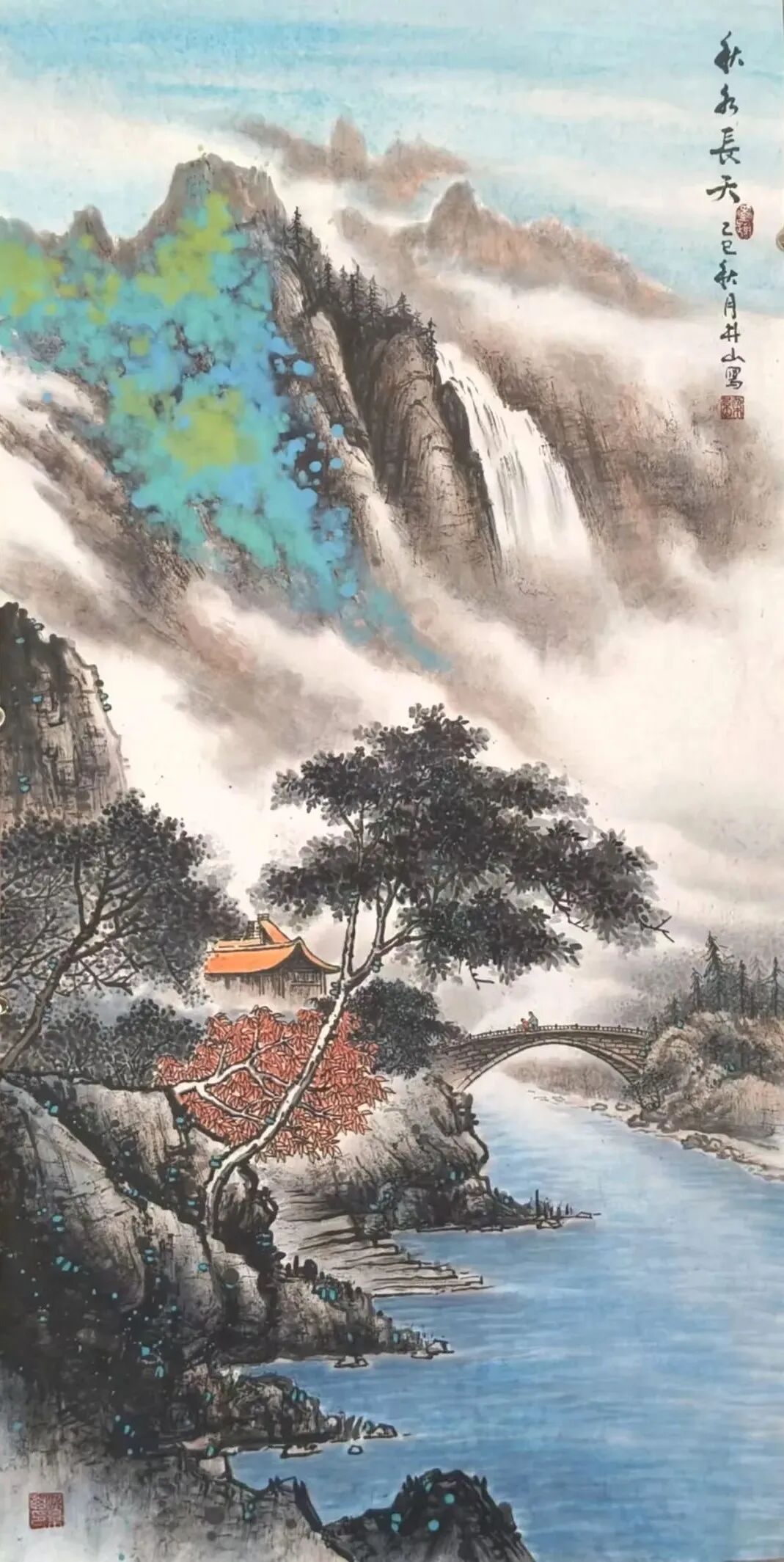 秋山飞瀑间,丹枫与石桥相映,淡蓝水色衬出天高气爽,笔墨清雅中见秋意辽阔,将秋日山水的旷远与闲静融于画中。