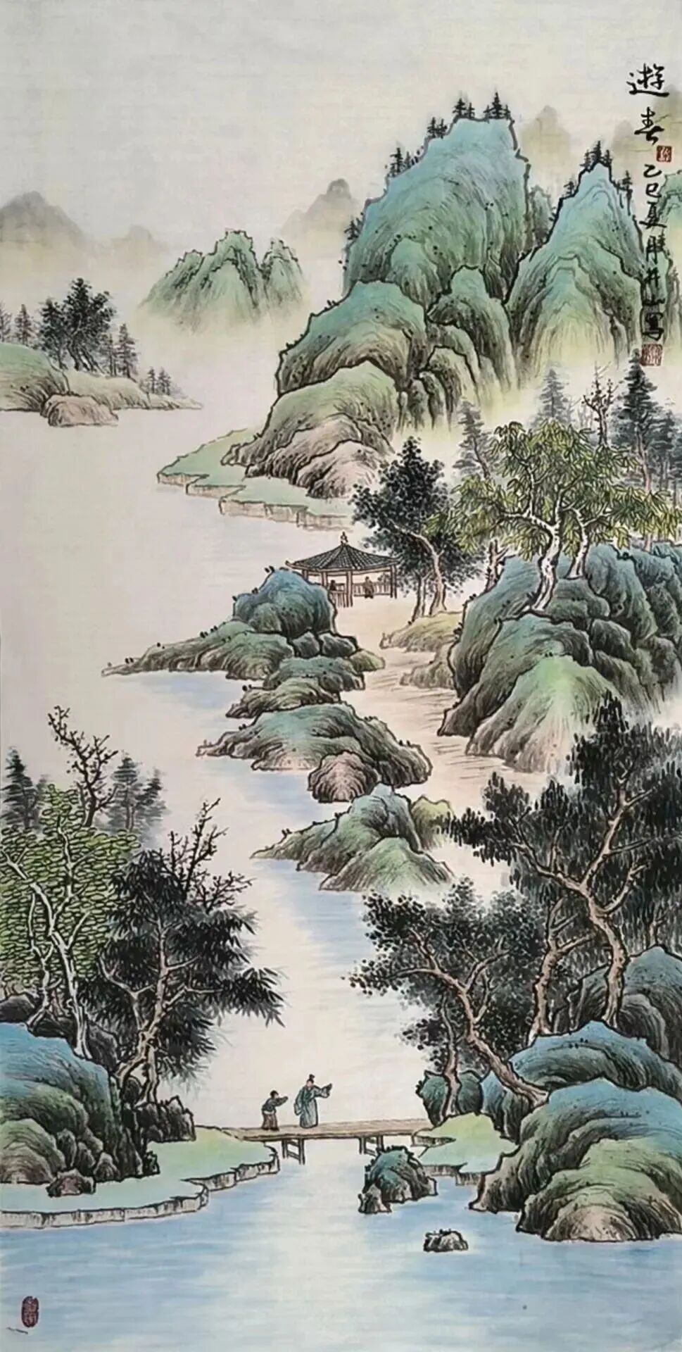 这幅青绿山水以浅绛设色绘春景,山峦叠翠间溪水蜿蜒,亭台与行人衬出闲逸氛围,笔墨秀润中见生机,尽显春日游赏的雅致意趣。