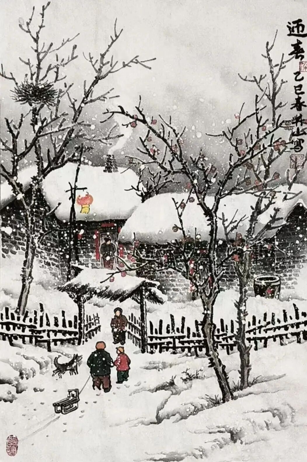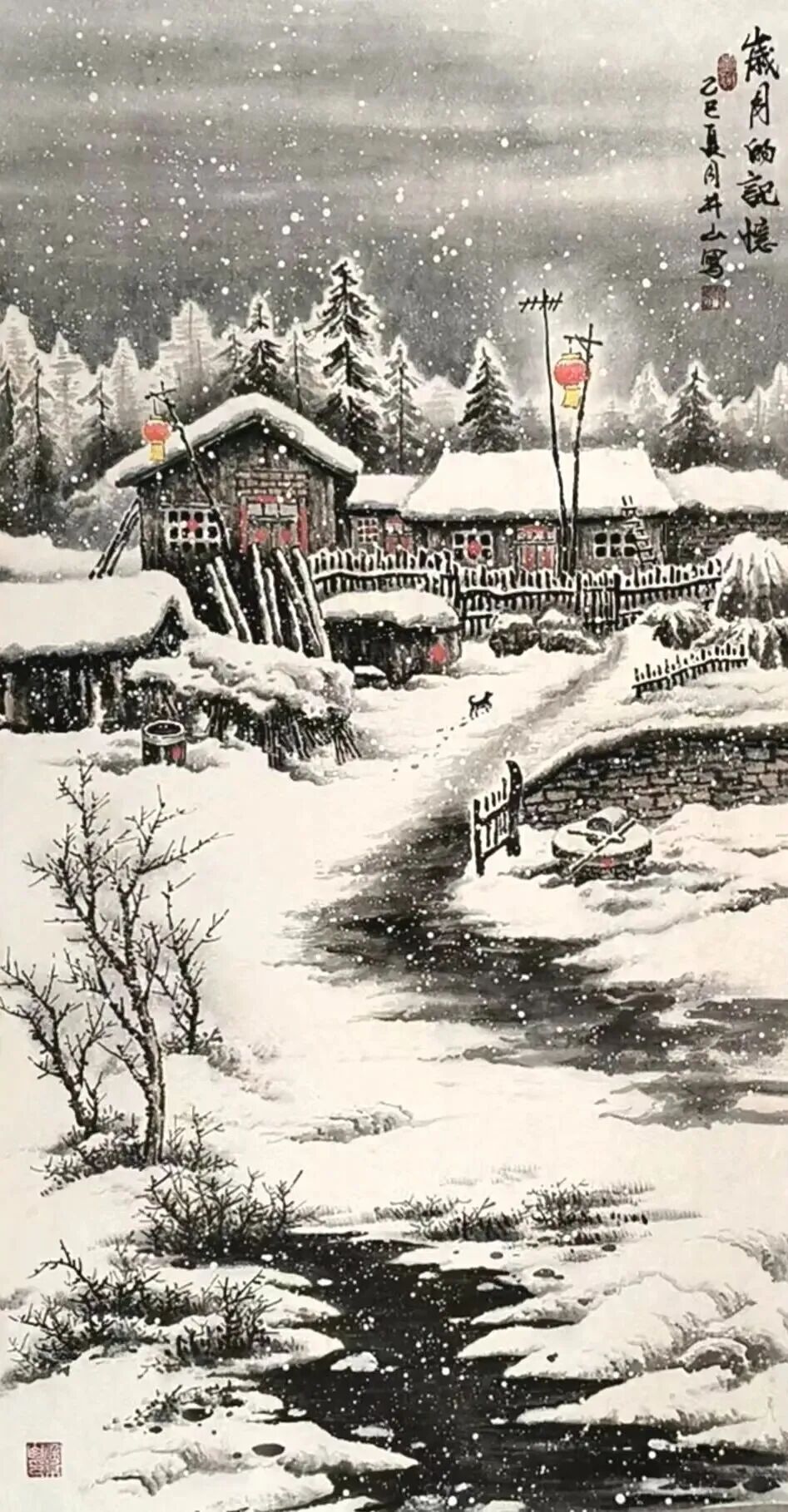 雪景村落里,红灯、鸡群与孩童相映,墨色浓淡铺就雪意,生活细节衬出岁月温情,以写实笔墨绘出北方冬日的烟火与暖意。