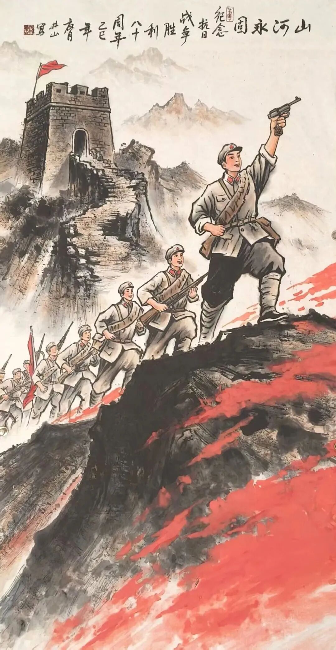 以长城为背景,战士群像笔墨刚劲,红彩晕染衬出壮志豪情,兼具传统水墨与红色主题的感染力,彰显家国情怀。