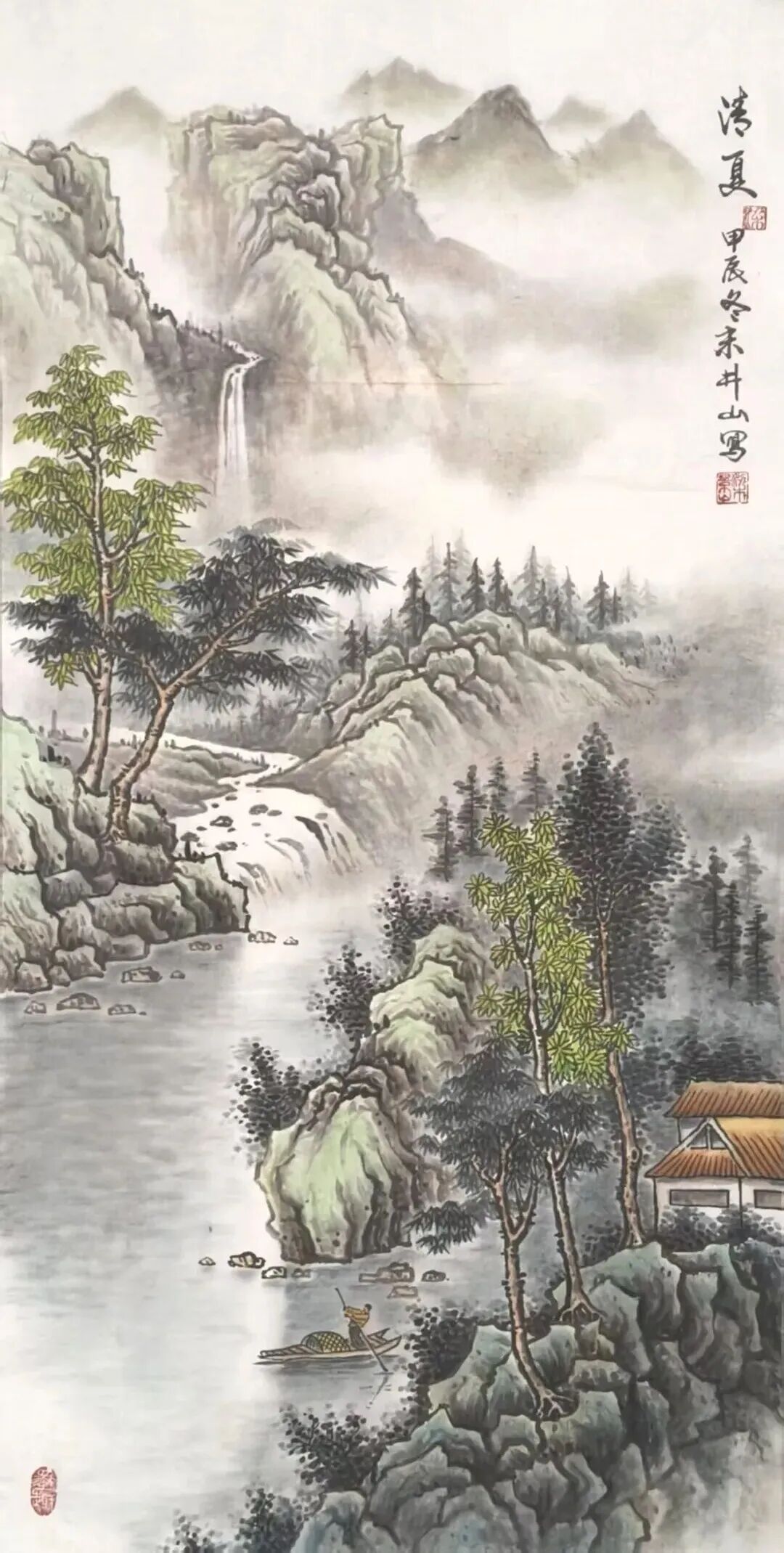 淡彩山水绘盛夏之景,飞瀑流云裹着葱郁林木,孤舟渔者添悠然,笔墨疏朗间见清凉,将夏日山水的空灵与闲适融于尺幅。