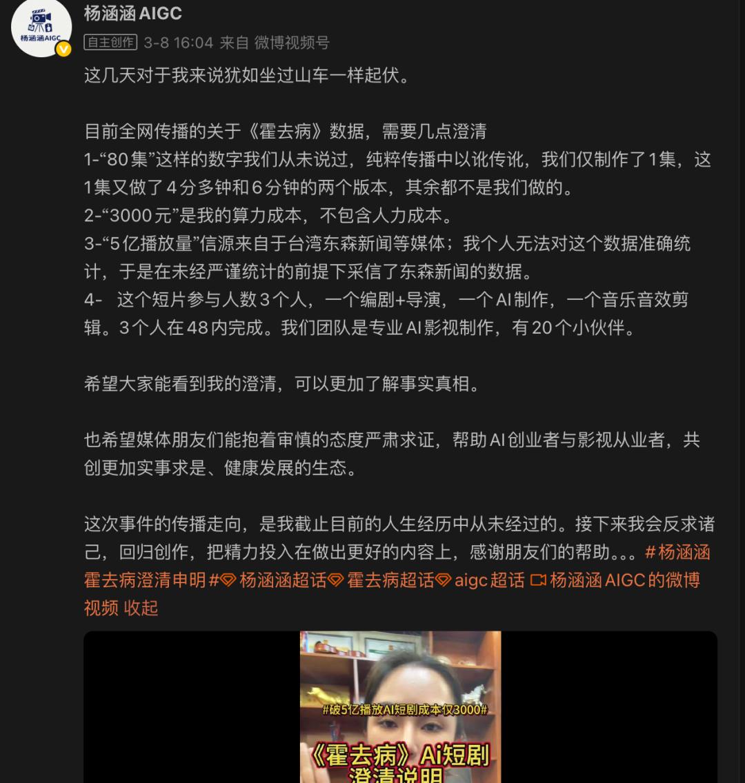 然而神话破灭的速度比崛起更快,在自媒体质疑“根本找不到80集AI短剧《霍去病》成品”后,该片导演杨涵涵下场辟谣,给出几组真实数据:
