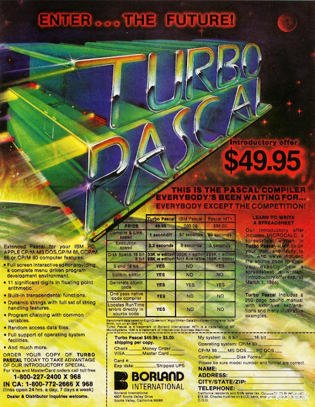 1983年,Turbo Pascal横空出世。你知道当时的编译器什么样吗?动辄好几张软盘,安装半小时,编译一根烟。而Turbo Pascal呢?一张5.25英寸软盘,塞进去就能用,写完代码一敲键盘,嗖一下就编译好了。