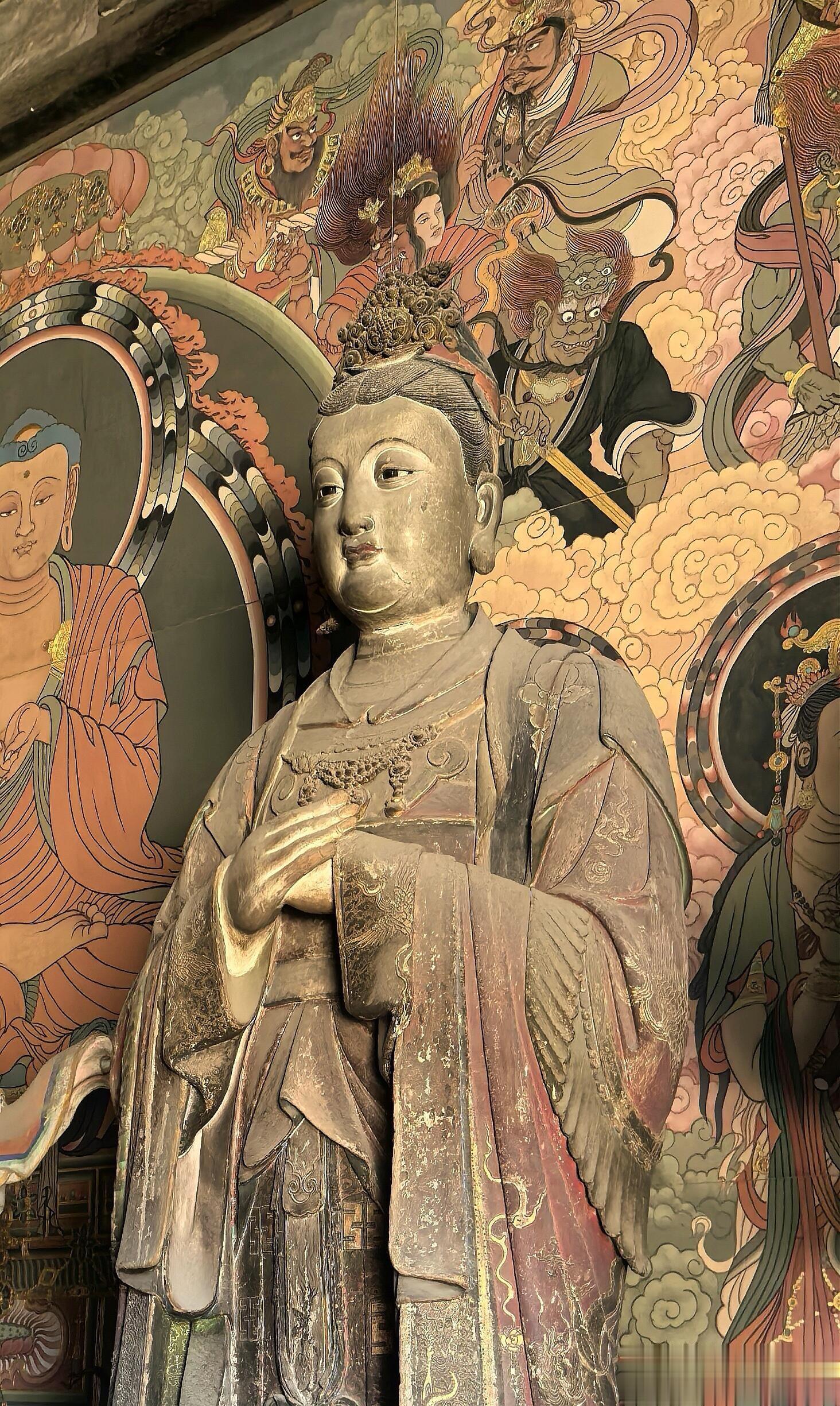 三圣殿内的“华严三圣”泥塑堪称金代雕塑的教科书。阿弥陀佛左手持莲台,花瓣的翻卷角度精确到毫米,每片花瓣的阴影都指向同一个光源点;观世音菩萨的珞璎由数百颗珠串组成,每颗珠子都雕刻出绳结纹路,仿佛轻轻一扯就会散落;大势至菩萨的宝冠上,镶嵌着用螺钿制成的星辰图案,在特定角度下会折射出七彩光芒。最妙的是三尊造像的眼神——无论站在殿内哪个位置,都感觉佛眼在轻轻追随,这种“目光追人”的雕刻技法,让千年后的观者依然心生敬畏。