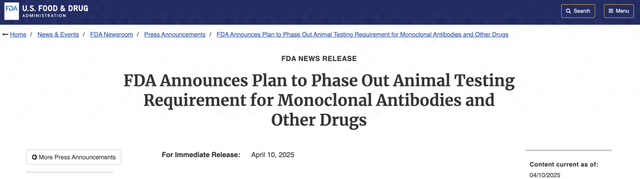 (内容来源:https://www.fda.gov/news-events/press-announcements/fda-announces-plan-phase-out-animal-testing-requirement-monoclonal-antibodies-and-other-drugs)