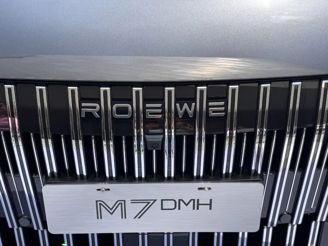 荣威M7 DMH由前劳斯莱斯设计总监约瑟夫·卡班亲自操刀,融合东方中正哲学与现代简洁设计,车头采用了直瀑式设计,看着典雅大方,车头中间还有会呼吸灯语的LOGO灯,配合车头两侧的光轨日行灯,点亮以后辨识度相当出色。